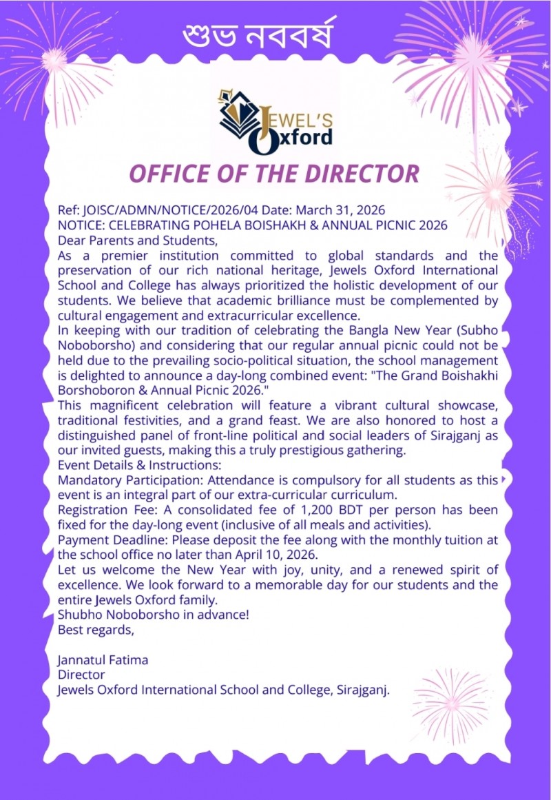 In keeping with our tradition of celebrating the Bangla New Year (Subho Noboborsho) and considering that our regular annual picnic could not be held due to the prevailing socio-political situation, the school management is delighted to announce a day-long combined event: "The Grand Boishakhi Borshoboron & Annual Picnic 2026."