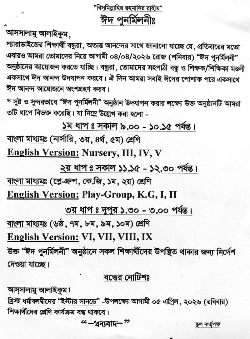 ০৪/০৪/২০২৬ (শনিবার) "ঈদ পুনর্মিলনী-২০২৬" অনুষ্ঠানে সকল শিক্ষার্থী নির্দিষ্ট সময়ে উপস্থিত থাকবে। Friday, April 3, 2026